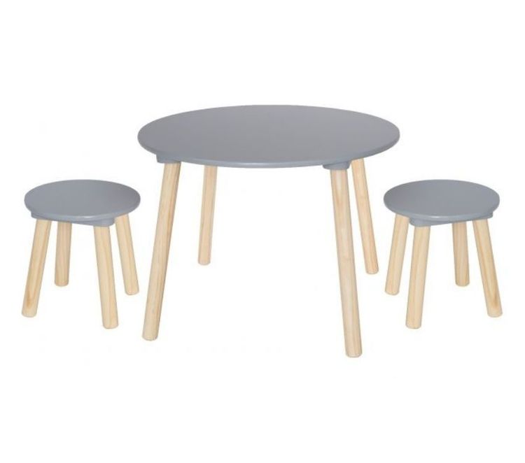 Ett fint och smart bord till barnrummet i obehandlat trä och med gråmålad bordsskiva. Tillsammans med de två tillhörande pallarna skapar de ett fint möbelset som du kommer att ha mycket glädje av. Ditt barn kan sitta bekvämt och pyssla eller leka, och det blir en bra hörna för pennor och ritblock. Du kan enkelt torka av bordet och stolarna med en fuktad trasa.