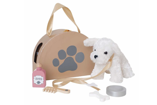Supersöt hund i en väska från svenska Jabadabado. Med denna söta hund kommer ni att få mycket glädje och lek. Setet innehåller:1 hund i koppel1 hundkoja att sova i1 matskål1 hundben1 kam1 schampoflaskaMått: 22x16x9 cmMaterial: Hård papp. trä, polyesterDesigner: JaBaDaBaDo