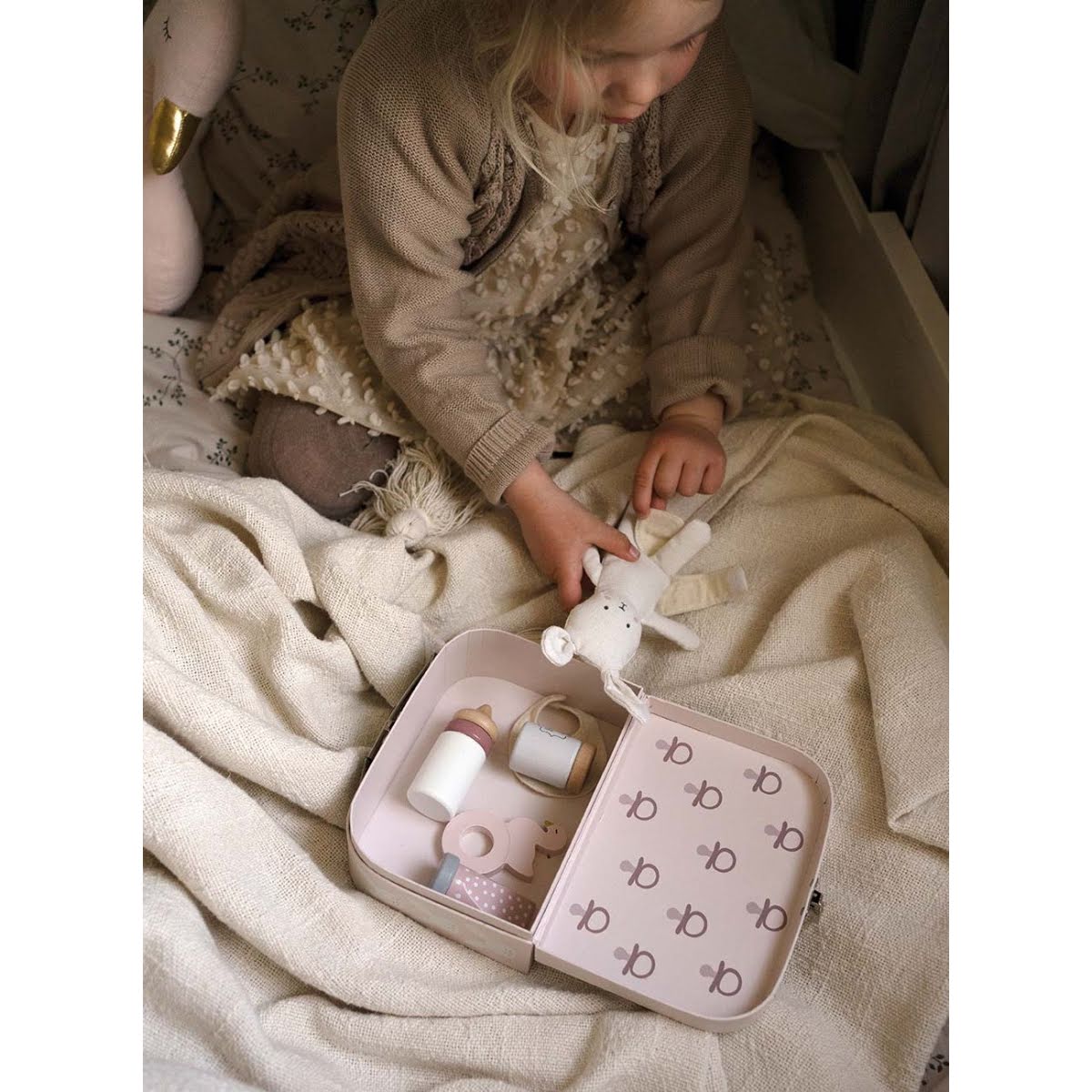 Supersöt kanin i en väska från svenska JaBaDaBaDo. Med denna söta kanin kommer ditt barn att få mycket glädje och lek. Setet innehåller:en kaninen haklapp med kardborrebanden blöja med kardborrebanden burk med babypuderen tub med salvaen nappen nappflaskaen skallra svanen väska i hårdpappMått: 19x13x7 cmMaterial: Hårdpapp. trä, bomull, metallDesigner: JaBaDaBaDo