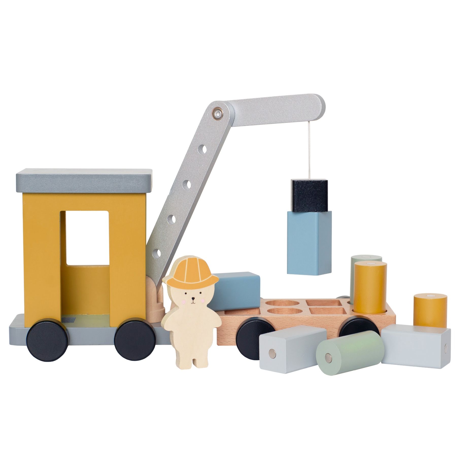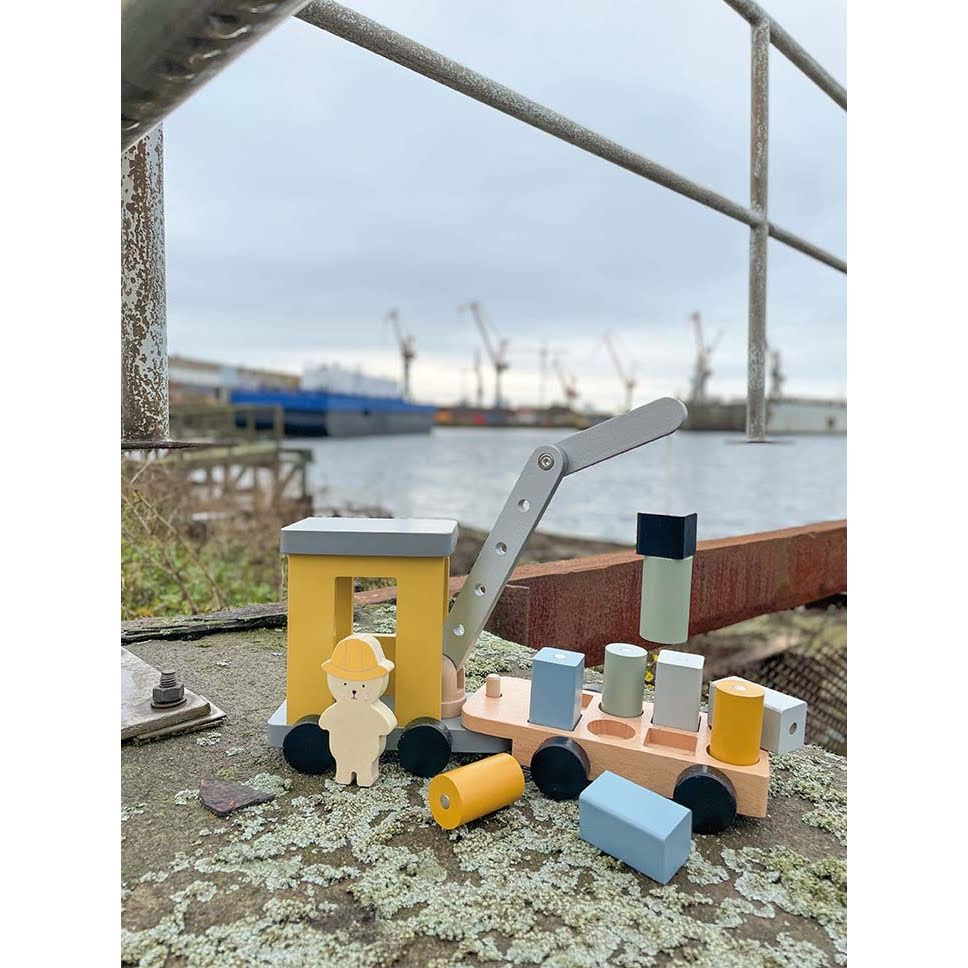 Chauffören styr kranen som går att höja och sänka samt vrida åt olika håll för att plocka upp de 8 klossarna i olika färger. Kranen kan köras med eller utan det avtagbara släpet.