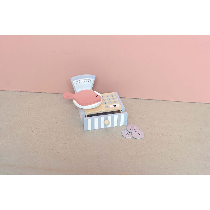 Marknadsståndet har två hyllplan med 6 fack fyllda med diverse matvaror samt en liten disk där kunden betalar.