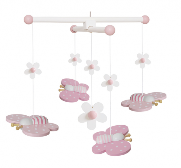 En mycket fin och elegant mobil från svenska JaBaDaBaDo och som är helt gjord av trä. Ditt barn kommer att älska att titta på på de fina fjärilar runtomkring, vilket gör ditt barn tryggt när det ska sova. Mobilens färger och mönster kommer att utveckla ditt barns sinnen och motorik under dess första månader. Så snart ditt barn kan nå mobilen bör du dock avlägsna den från sängen.