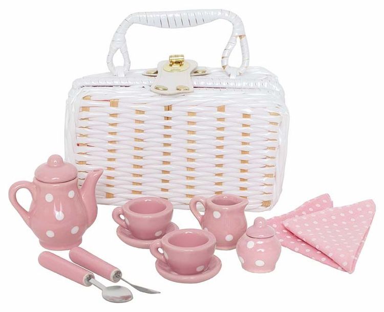 Picknickkorg med en söt teservis i porslin. Komplett med hela 13 delar, perfekt för picknick eller tebjudning i såväl barnrummet som utomhus. Duka upp och bjud alla nallarna på fika. Teservisen kommer fint förpackat i en vit flätad picknickkorg med guldspänne i metall.. Korgen stängs med små knäppen på ovansidan.