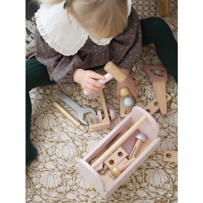 Denna verktygslåda från svenska JaBaDaBaDo är, förutom vacker att se på, både lättsam och lekfull. Ditt barn kommer att utveckla sin kreativitet och ha många roliga stunder. Innehåller totalt 22 delar: en verktygslåda, en linjal, en skiftnyckel, en skruvmejsel, en hammare, en såg, en skruvbräda, 3 spikar, 3 skruvar, 3 muttrar, 3 klossar, och 3 bultar.