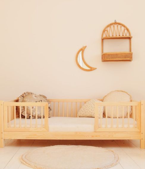 Sängen är tillverkad i slitstarkt trä med stabil konstruktion som ger lång hållbarhet och trygg användning i vardagen. Det integrerade skyddsräcket på huvudbädden minskar risken för att barnet ramlar ur sängen under natten – perfekt vid övergången från spjälsäng till juniorsäng.