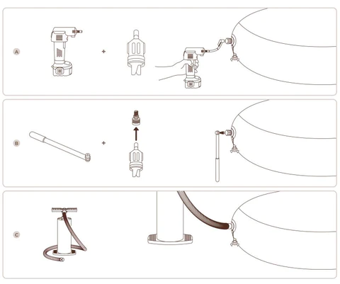 Trampolinen blåses upp med en handkompressor eller cykelpump med hjälp av den medföljande adaptern. Det rekommenderade lufttrycket är 0,25 bar.
