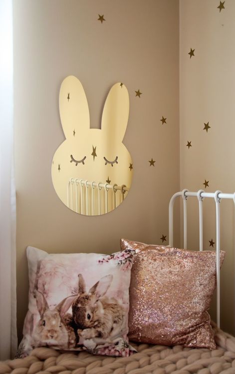 En vacker spegel i form av en kanin. En vacker dekoration i barnrummet. Dessa speglar är gjorda i akryl, och är därför lättviktiga och passar därmed perfekt i ett barnrum.