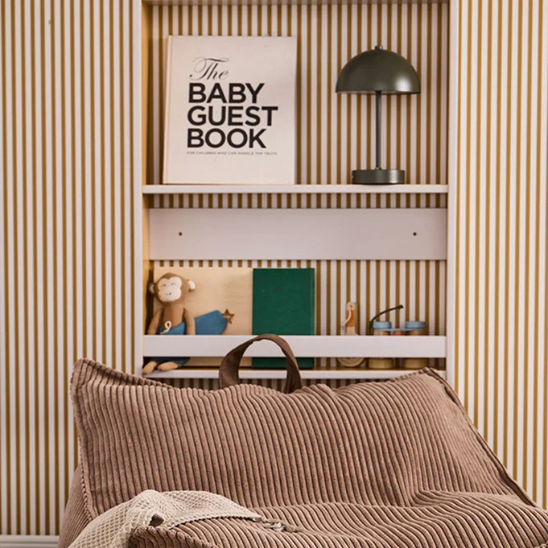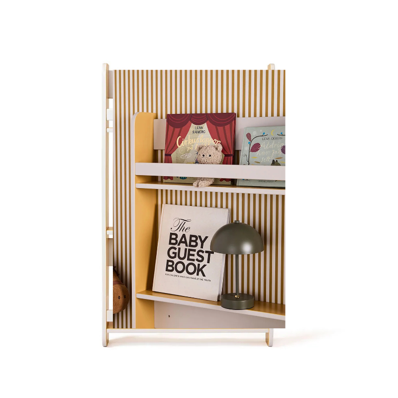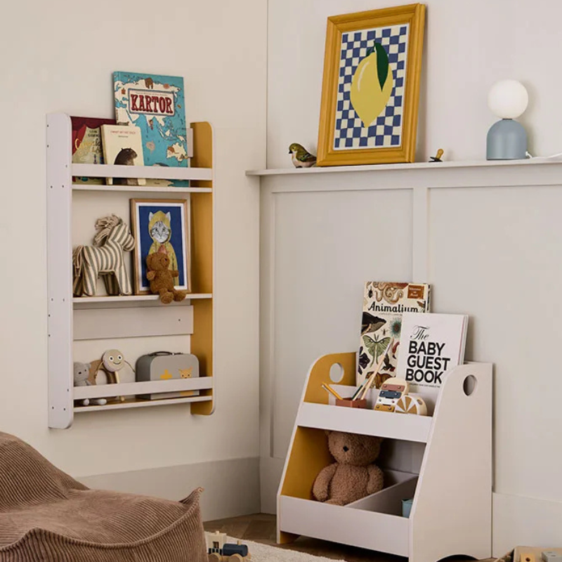 Vår vägghylla är perfekt för att visa upp både böcker och mjukdjur. Det främre räcket håller böckerna på plats och gör det enkelt att se vilka titlar som finns att välja mellan. Även förvaringen av mjukdjur blir smidig och överskådlig.