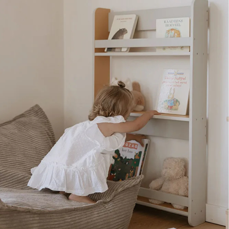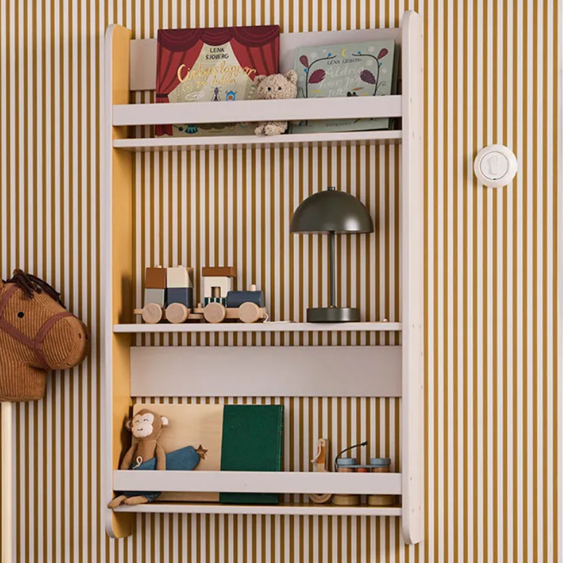Hyllan är enkel att montera och kan till och med placeras bakom en dörr för att skapa extra förvaring i mindre utrymmen. Insidorna har en kontrastfärg som lyfter den lugna grå utsidan och ger hyllan ett stilrent uttryck. En praktisk och dekorativ lösning som hjälper till att organisera och framhäva barnets favoritsaker – och som passar lika bra i vilket rum som helst.