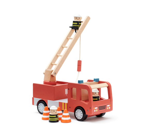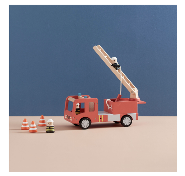 Superrolig brandbil från svenska Kids Concept i FSC certifierat trä. Två söta brandmän ingår samt 3 konor.
