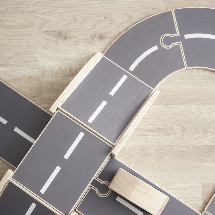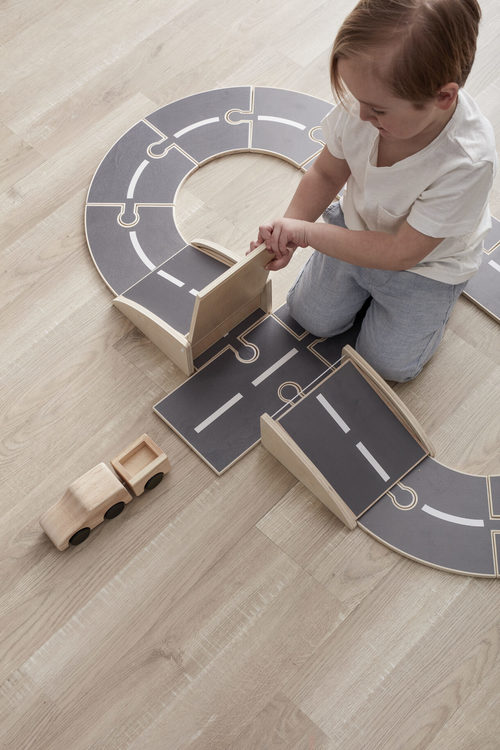 En fantastisk, byggbar trä bilbana bilbana från Kids Concept. Med denna bilbanna kommer du att skapa en häftig och inspirerande miljö för ditt barnrum. Ditt barn sätter enkelt ihop delarna själv, och kan därigenom skapa sina egna och unika bilbanor. Detta är tanken med denna bilbana, att stimulera och uppmuntra barnens kreativitet och lek. Samt därigenom stimulera barnets utveckling långsiktigt. Att lelka med denna bilbanna hjälper barnet med koordination, samverkan mellan hand-öga och att utveckla det logiska tänkandet. Kort sagt, en bilbana med en massa syften. Paketet innehåller raka vägar, kurvor och avfartsvägar och en bron som går att fälla upp och ner