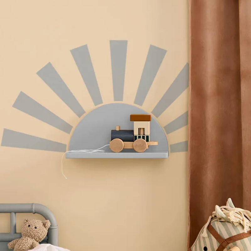 Dessutom medföljer ”solstråle”-stickers i ett självhäftande material med satinfinish. Placera dem runt hyllan för att skapa en lekfull och grafisk effekt. Stickersen är enkla att sätta dit och ta bort. Testa alltid på en dold yta innan full applicering. De kan vanligtvis tas bort från tapet och målade väggar, men det beror på underlaget.