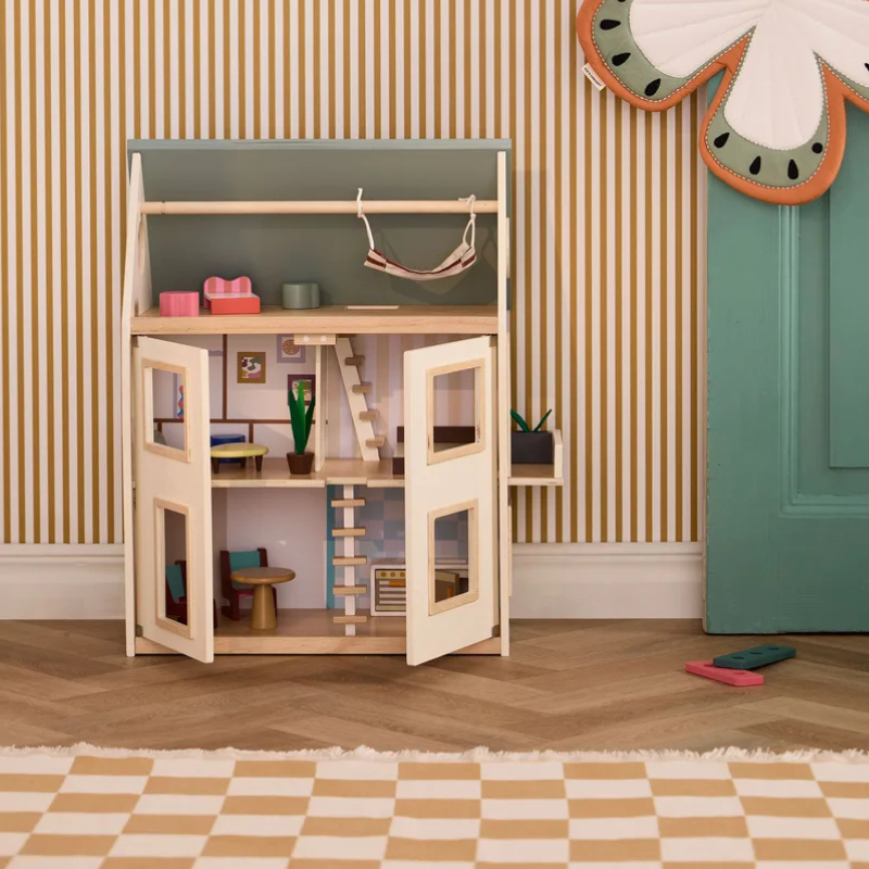 Välkommen hem till en familj som älskar inredning! Det här dockhuset i tre våningar visar upp harmoniska stilar, färger och möbler som samlats på resor världen över. På taket sitter solpaneler, och högst upp finns ett lekrum med en hängmatta – perfekt för avkoppling.