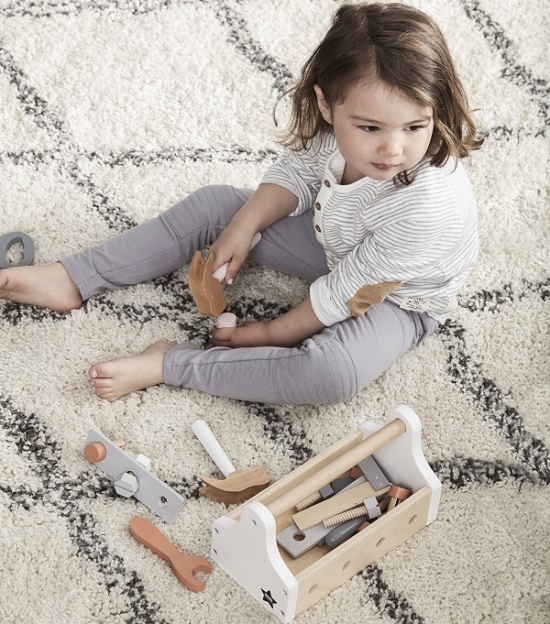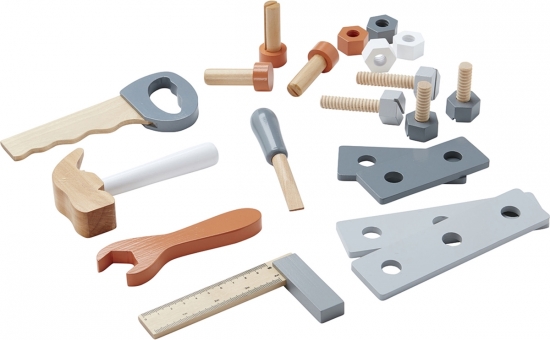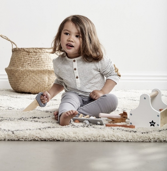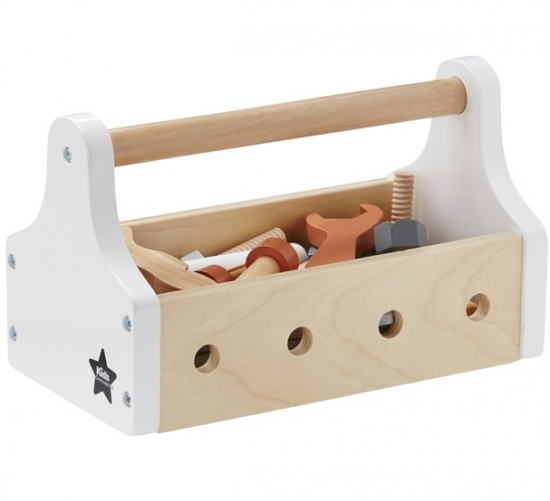 En mycket uppskattad och fin verktygslåda från populära Kids Concept. Denna välgjorda verktygslåda innehåller hela 20 delar för ditt barn att snickra och laga med. Praktiska hål på sidan av verktygslådan gör att ditt barn enkelt kan sätta i både skruvar och spikar. Bland innehållet hittar du en hammare, en såg, skruvar, muttrar och en massa annat. Samtliga saker är såklart helt utan vassa kanter så att ditt barn kan leka med dem säkert. Lådan och verktygen är helt tillverkade av trä och passar barn från ca 3 år och uppåt.
