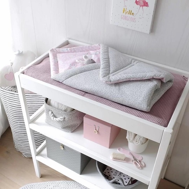 Skötbordet har två praktiska hyllor så att du har blöjor, babykräm och annat som du behöver nära till hands vid blöjbyte.