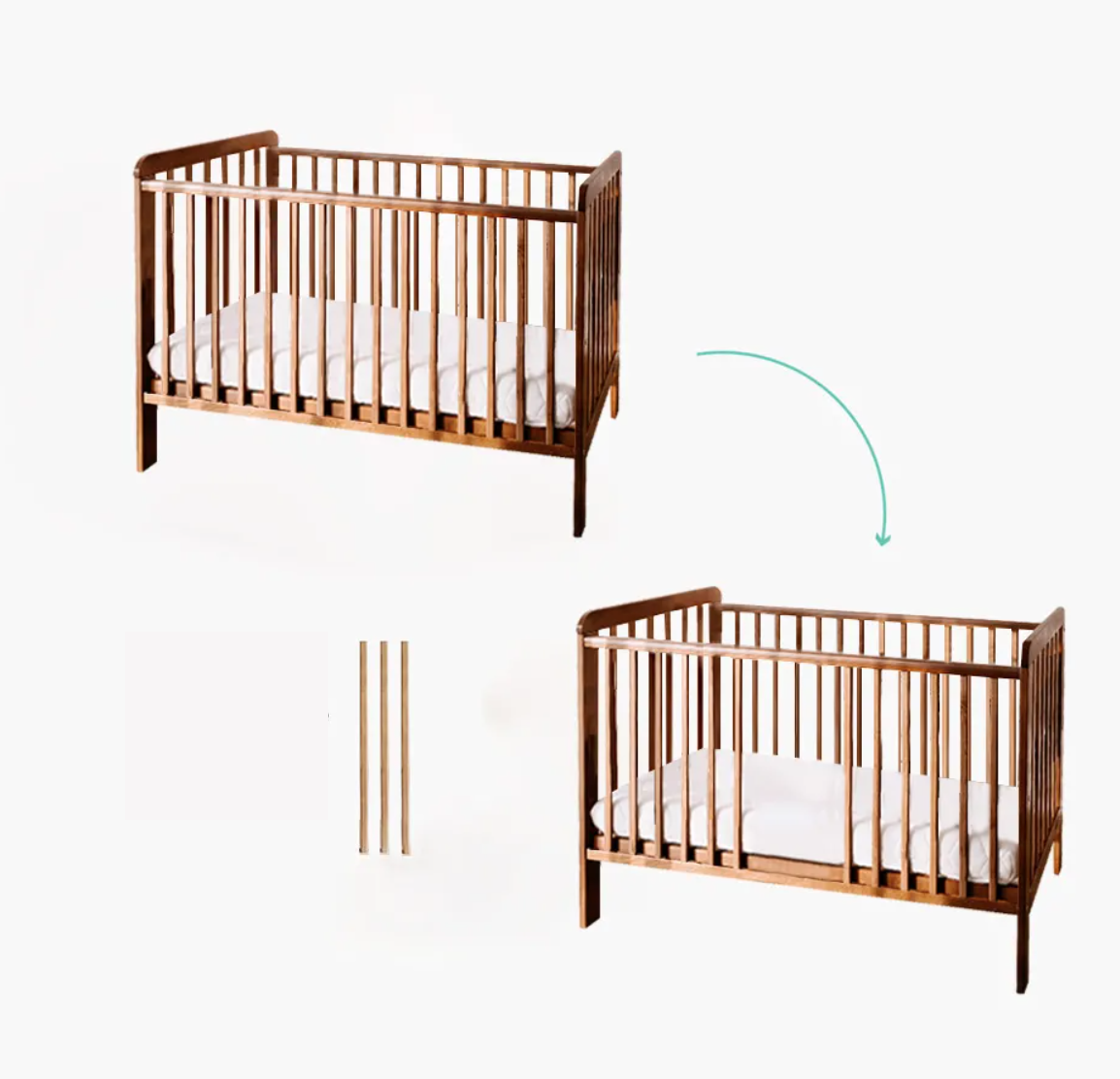 Den här fina spjälsängen kan anpassas efter barnets utvecklingsfaser, bland annat genom tre nivåer på sängbotten. När barnet är stort nog att kliva i och ur sängen själv, så kan man även ta bort tre spjälor. Unikt och praktiskt!