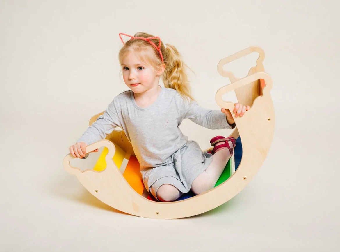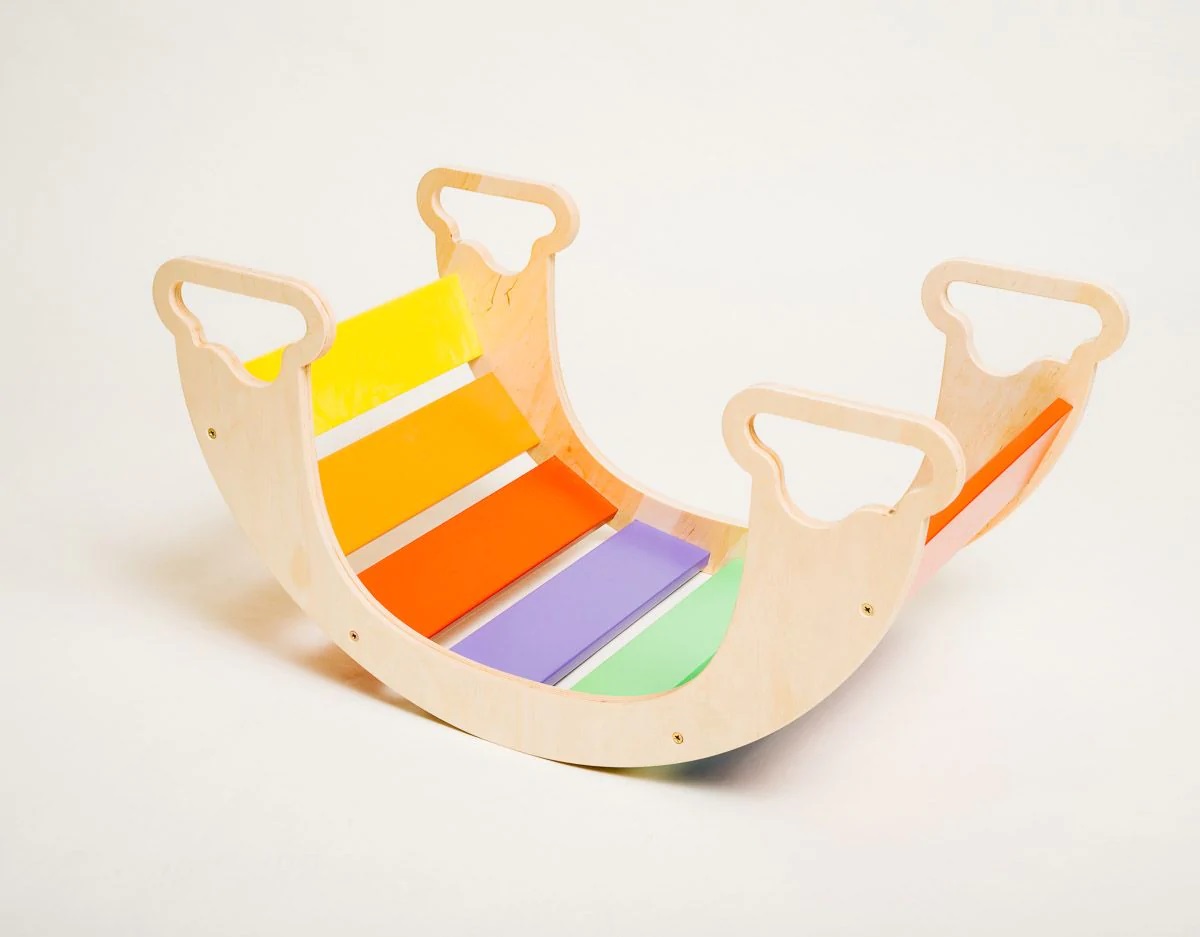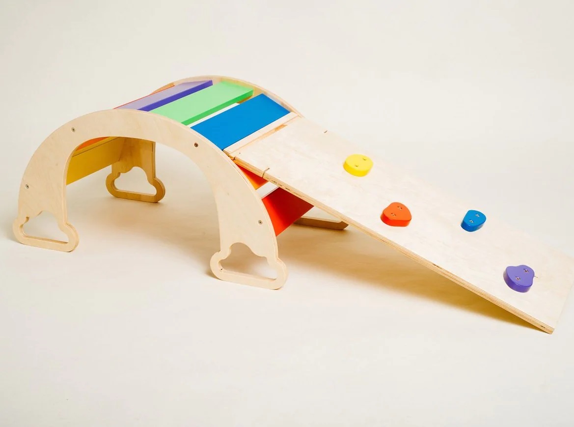 Bara fantasin som sätter stopp för hur du kan använda denna klättringsställning! Använd rampen som en rutschkana för minstingar. Vänd på det och simsalabim så har du en gunga! Lägg den på sidan mot en vägg och du får en leksaksförvaring! De större barnen kan använda klättringsbågen som ett mål.