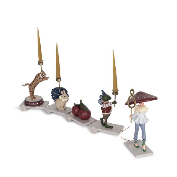 Elegant och handgjort födelsedagståg med skogstema från danska Konges Sløjd!Klä födelsedagsbordet med en älva som går med en groda, körsbär, en magisk kanin och en tiger. Älvan har plats för barnets ålder i handen och djuren har plats för ljus. Ljushållare och siffror 1-9 medföljer.Mått: Längd 69 cmMaterial: 100% polyresinDesigner: Konges Sløjd