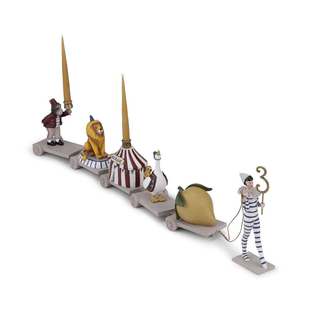 Elegant och handgjort födelsedagståg från danska Konges Sløjd!Klä födelsedagsbordet med Pierrot som går med en citron, en gås, cirkustält, ett lejon och en apa. Cirkustältet och apan har plats för ljus och Pierrot har plats för barnets ålder i handen. Ljushållare och siffror 1-9 medföljer.Mått: Längd 69 cmMaterial: 100% polyresinDesigner: Konges Sløjd