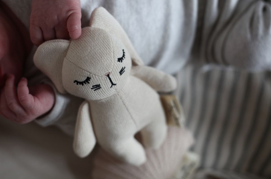 Underbar babyskallra i form av en vit kanin från danska Konges Sløjd!