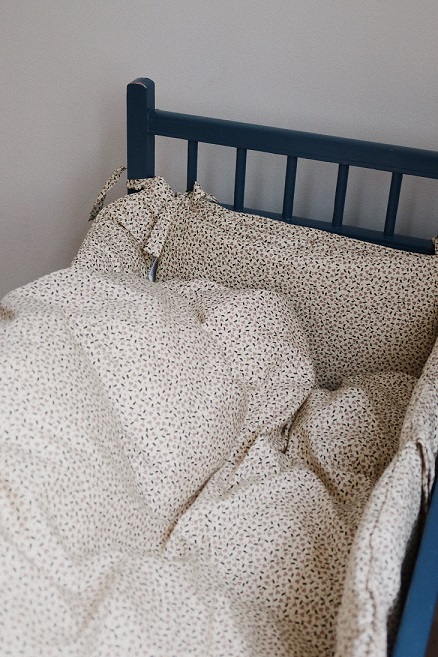 Spjälskyddet fästs med söta fiskbensband och är lämpligt för vaggor, spjälsängar och barnsängar med stödbräda med ribbor.