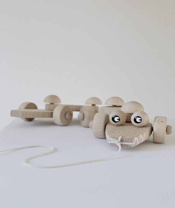 En underbart fin och fantastisk träleksak från Ella & Frederik, i formen av en krokodil som följer med när barnet drar den över golvet.