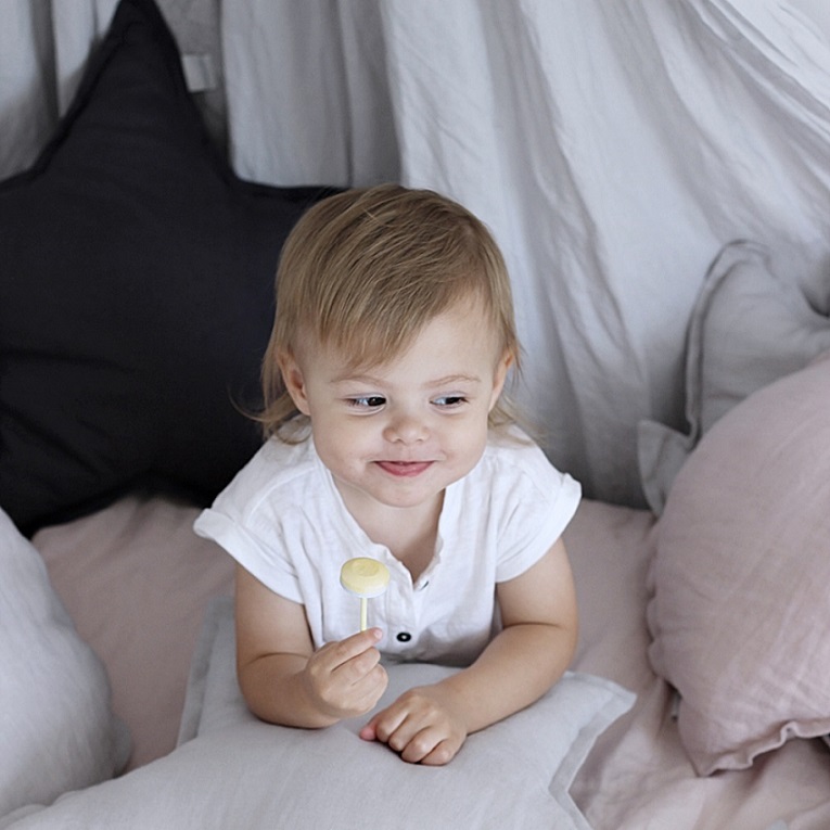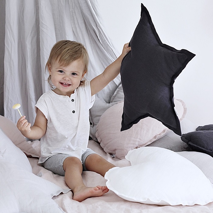Denna mycket fina kudde i form av en stjärna ger en mycket fin atmosfär till barnrummet eller varför inte till det egna sovrummet. Gjort helt av linne med material som är 100% anti-allergena. Enkel att tvätta själv och hålla ren och fräsch.En mycket populär inredningsdetalj till barnrummet.Mått: diameter ca 44 cm.Material: 100 % linne, fyllning av polyesterbollar.Designer: Cotton & Sweets