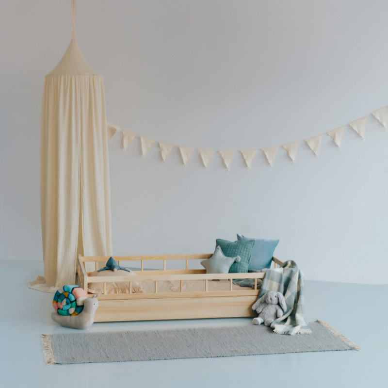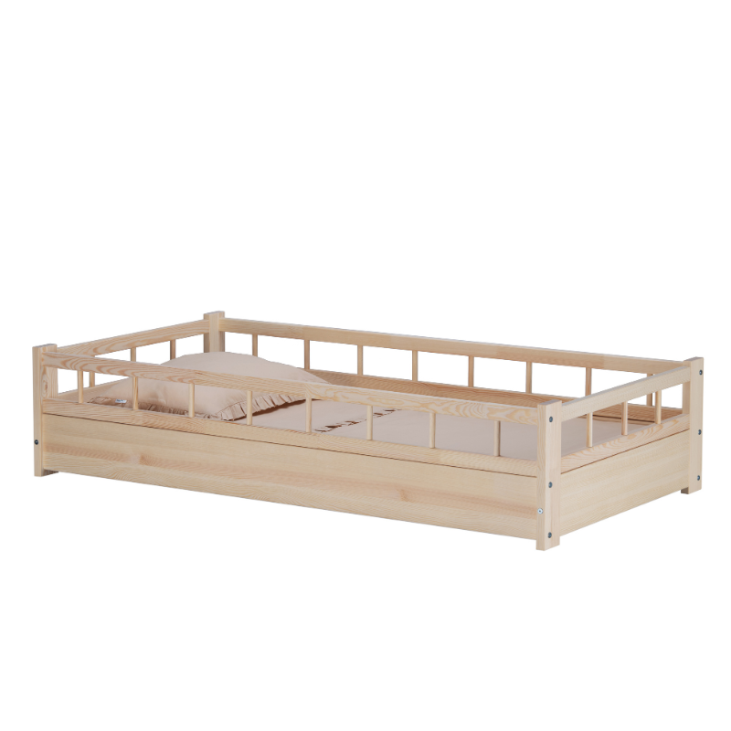 Låg natur barnsäng med skydd