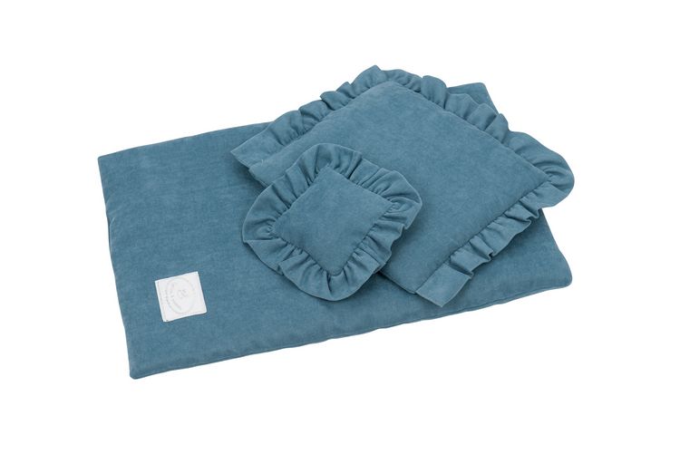 Ett underbart fint bäddset till docksängen eller dockvagnen bestående av ett tjockt täcke, en stor kudde och en lite mindre kudde. Kuddarna har fantastiska detaljer i form av volanger runt kanten. Ditt barn kommer att älska detta fina bäddset och att leka med sina dockor i det.