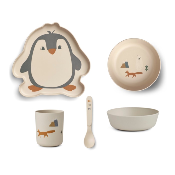 Ett vackert, tåligt och användbart matset från danska Liewood i fyra delar. Med den fina tallriken , skålen, skeden och koppen kommer du och ditt barn att förena nytta med nöje. Liewoods välkända  djurmotiv designen för matsetet och finns med på alla delar.