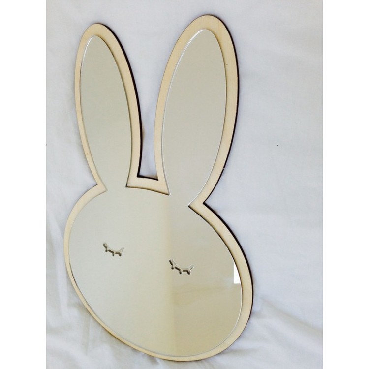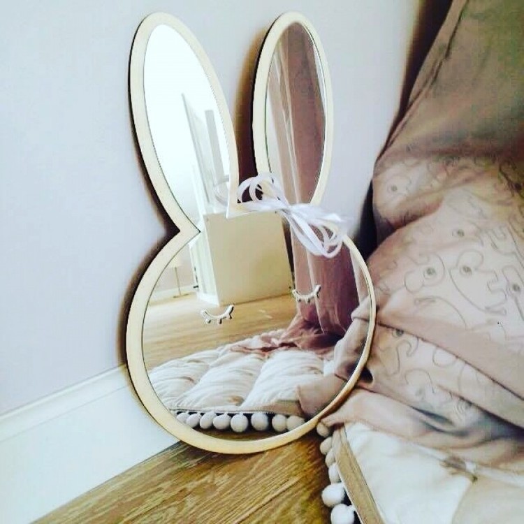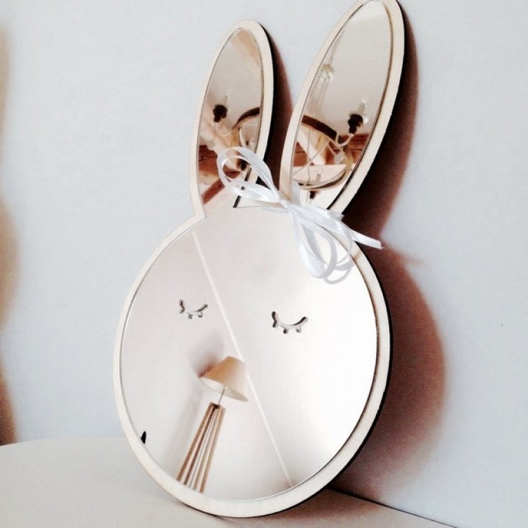 En vacker spegel i form av en kanin gjord av akryl, infällt i en träskiva för tålbarhet.. Spegel, spegel på väggen där…. En vacker dekortation i barnrummet.