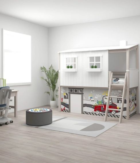 Selma är en fantastisk loftsäng med utfällbar tygsoffa! Perfekt för syskonen i ett litet rum, eller för ditt barns vänner när de ska sova över.