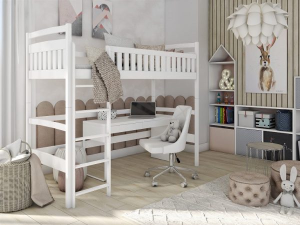 På vår fina loftsäng Mika har man tänkt till ordentligt för att optimera golvytan i barnrummet. Vi lovar att sängen kommer bli ditt barns favorit, och inte bara för att sova i då den med enkla medel kan bli en riktigt bra myshörna. Många dekorerar med sänghimlar, vimplar eller ljusslingor, bara din kreativitet sätter stopp.