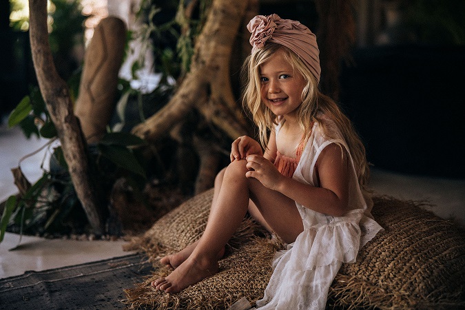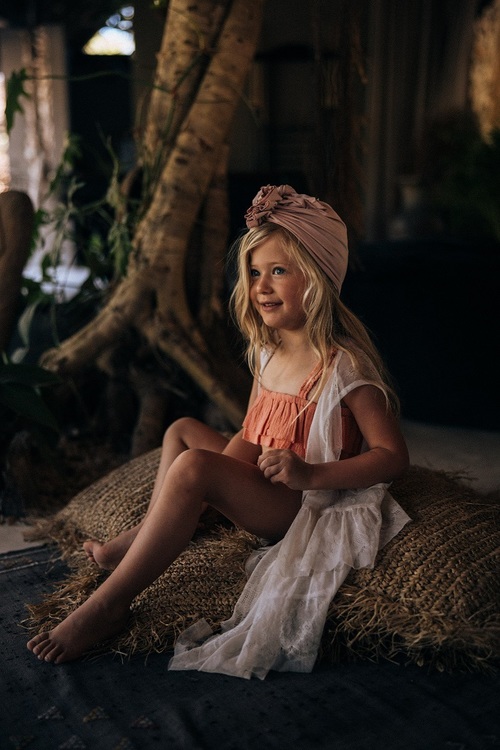 En söt turbanmössa i mjuk organisk bomull med en rosett och volanger under. Passar perfekt på stranden som skydd mot solen eller som alternativ till mössa under kyliga kvällspromenader. Material: 96% bambuviskos, 4% elastan. Tvättråd: 30 grader handtvätt. Torktumlas ej. Designer: Looks by Luks