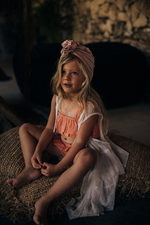 En söt turbanmössa i mjuk organisk bomull med en rosett och volanger under. Passar perfekt på stranden som skydd mot solen eller som alternativ till mössa under kyliga kvällspromenader.
