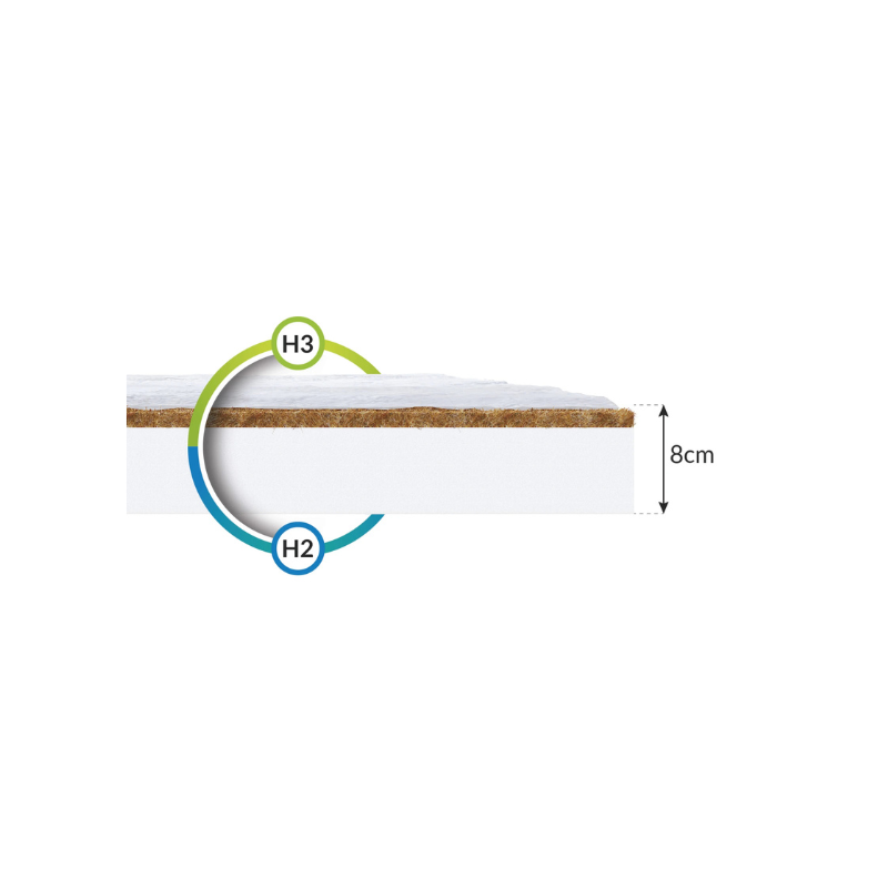 Madrassens kärna är barnvänligt polyuretanskum som inte deformeras vilket garanterar stöd för ryggen och sovkomfort. Kokosskiktet ökar luftflödet och förbättrar ventilationen. De ekologiska kokosfibrerna är dessutom ett antibakteriell och kvalsterresistent naturmaterial. Rekommenderas för kunder som föredrar fastare madrasser.