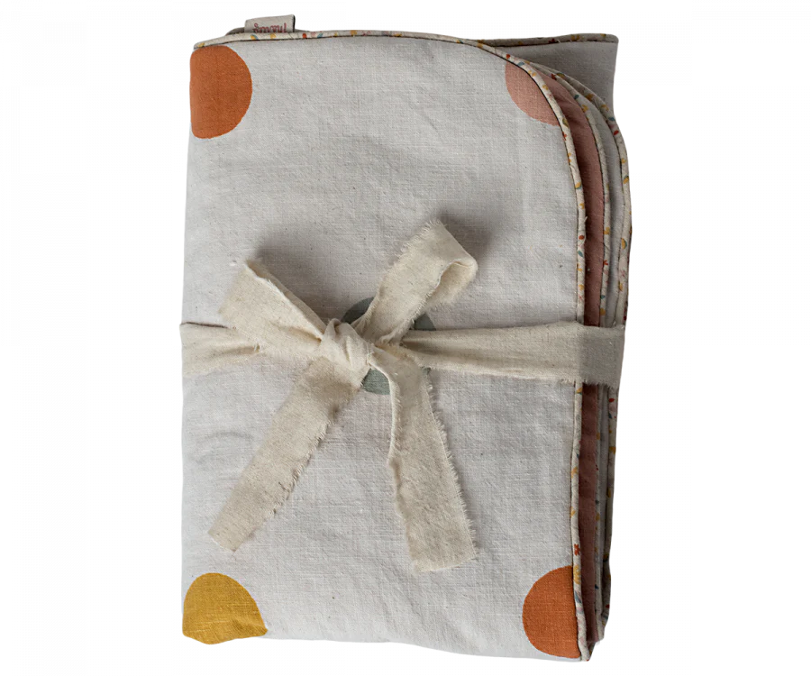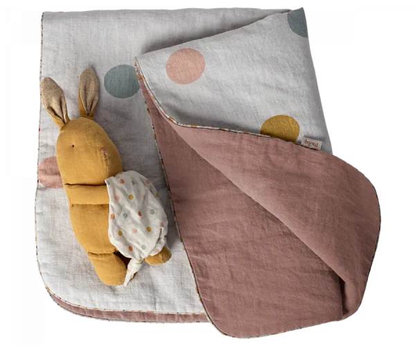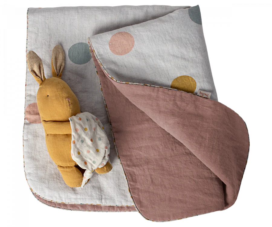 Supersöt filt med prickar för de allra minsta i familjen!Kan användas som ett täcke eller en lekmatta när barnet leker på golvet.Mått: 89,5 cm x 65 cmMaterial: Linne/ramie. Fyllning: polyester. Tvättråd: 30 graderDesigner: Maileg