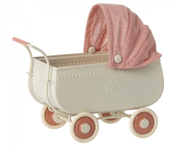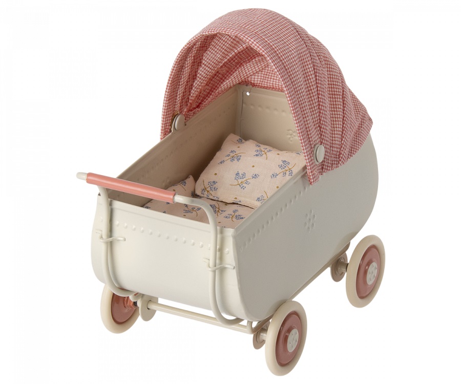 Superfin vintage barnvagn till Maileg finaste vänner. Dockvagnen är tillverkad i metall med ett fint blommigt bäddset.