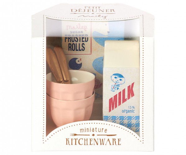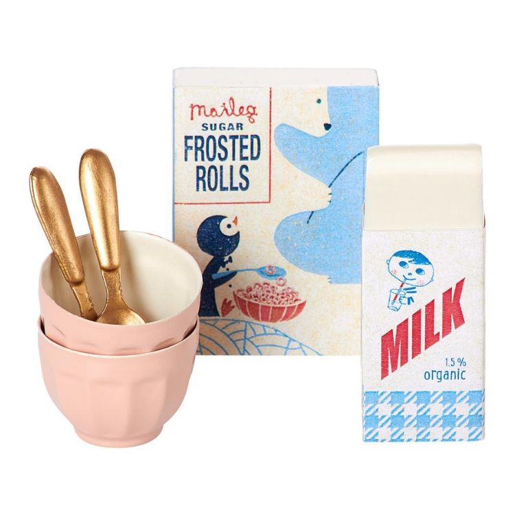 Man måste ju ha lite mat inne i dockhuset, inte sant? Med detta underbara frukostset går ingen hungrig på morgonen.Oerhört detaljrik produkt som är helt handgjord av det populära företaget MailegStorlek: – Koppar höjd 3,5 cm – Skedar längd 4,5 cm – Flingpaket höjd 7 cm – Mjölkpaket höjd 7,5 cm – Kommer i en fin presentförpackningÅlder: Från 3 år.Material: Metall.