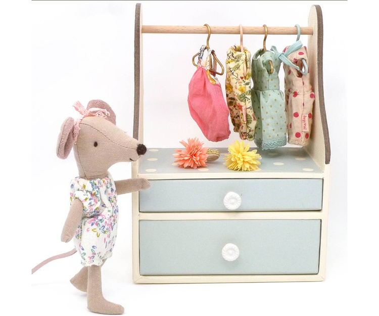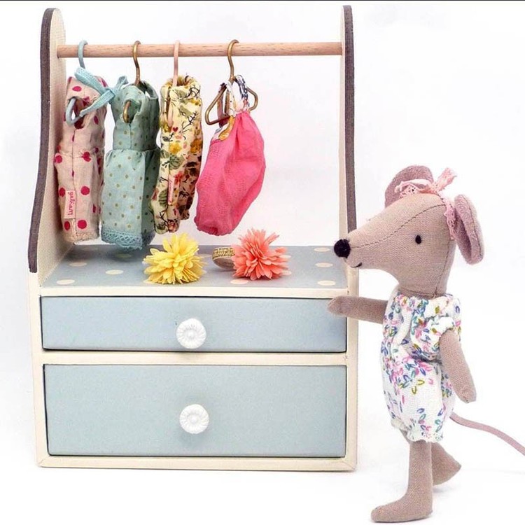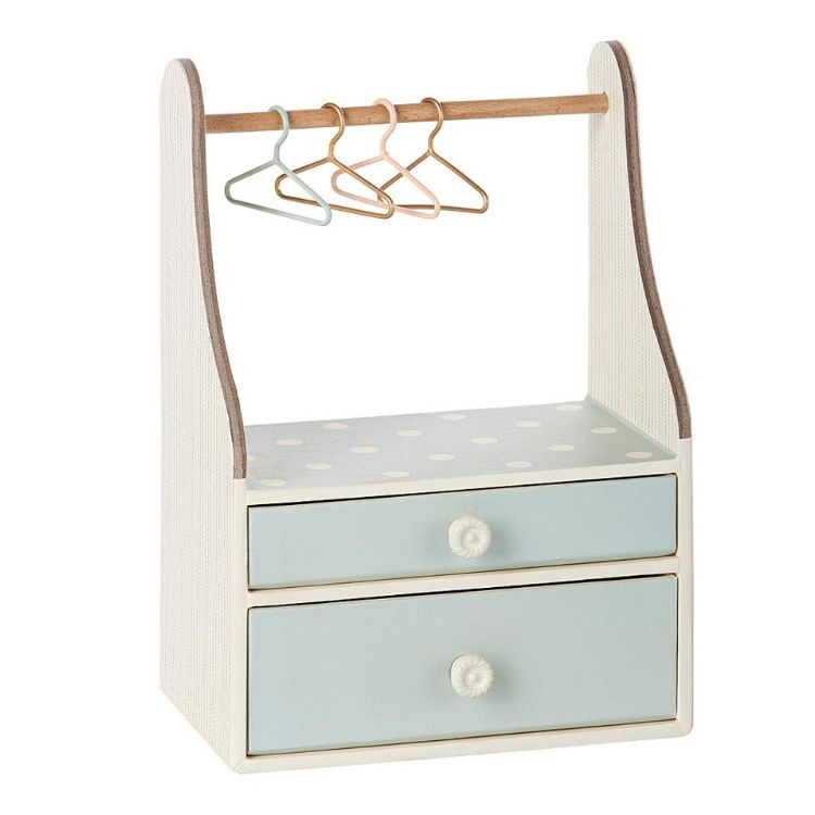 Vem vill inte ha denna fina garderob i vacker mintfärg att hänga de små dockkläder som finns hemma.Till dockhuset eller varför inte på en fin hylla, så har ni nu chansen med denna underbara dockhusmöbel.Oerhört detaljrik produkt som är helt handgjord av det populära företaget Maileg. Höjd: 9 cm. Ålder: Från 3 år. Material: Hård papp.Designer: Maileg