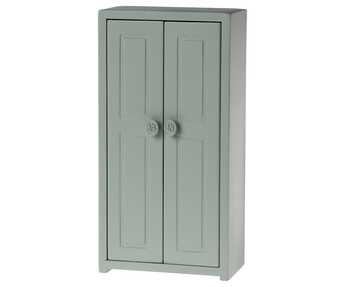 En liten garderob som hjälper musfamiljen att hålla ordning på sin garderob. Garderoben levereras med tre gyllene galgar. Oerhört detaljrik produkt som är helt handgjord av det populära företaget Maileg.