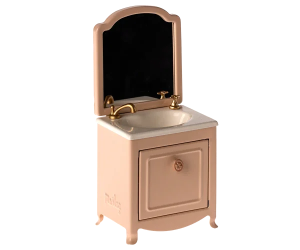 Vackert handfat med guldkran för det kungliga Maileg-slottet! Handfatet har en avtagbar spegel samt ett praktiskt underskåp där man kan förvara en liten handduk eller andra tillhörigheter till våra små kungligheter.Ålder: Från 3 år.Mått: Höjd cirka 15 cm. Bredd 6,5 cm. Material: Metall.Designer: Maileg