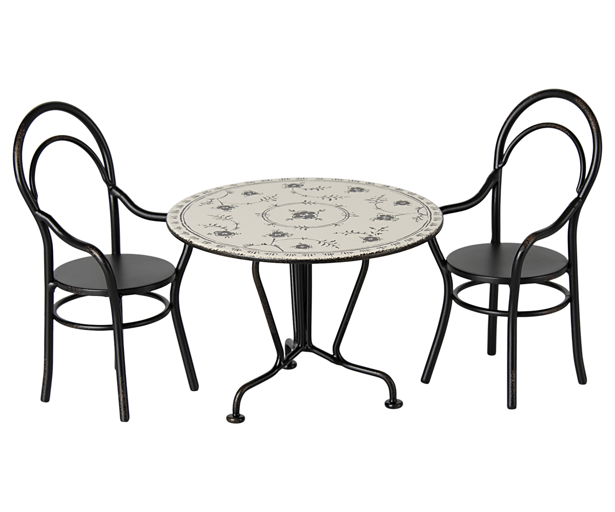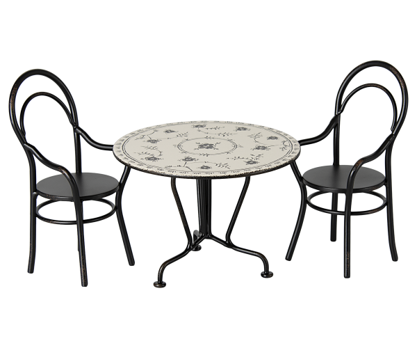 Bjud in en vän på söndagsmiddag vid det här fina matbordet! Det runda bordet levereras med två stolar i metall. Bordet och stolarna passar perfekt i dockskåpet ? och är lagom i storlek för kaniner och kaninungar i storlek 1 och 2 samt för Teddy-familjen. Oerhört detaljrik produkt som är helt handgjord av det populära företaget Maileg.