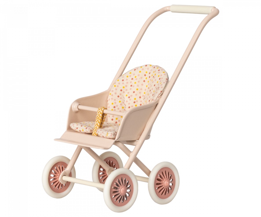 Superfin vintage barnvagn till Maileg finaste vänner.  Dockvagnen är tillverkad i metall med ett fint mönster på sittdynan. Mått: 13 cm Material: Metall, bomull och gummi. Designer:  Maileg