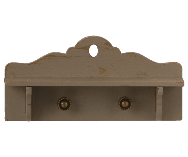 Underbar trähylla med vackra krokar som piffar upp vilket rum som helst i ditt dockhus!Oerhört detaljrik produkt som är helt handgjord av det populära företaget Maileg.Ålder: Från 3 år.Mått: 4 x 9 cm Material: TräDesigner: MailegObs! Enbart hylla ingår!