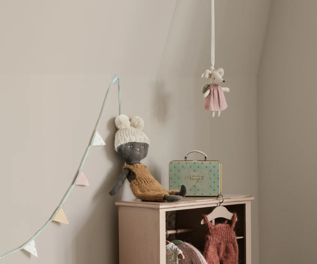 En söt mus ängel en liten resväska. Mått:7×11 cm Ålder: 0-3 år. Material: Metall/Bomull/Polyester/PolyurethaneTvättråd: 30 graderDesigner: Maileg
