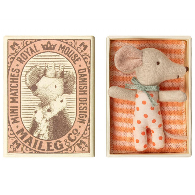 En söt flickbebis i en liten låda. Den fina lilla musen ser vaken ut på ena sidan och sovande på den andra sidan. Musen ligger i en söt sovsäck. Mått: 8 cm Ålder: 0-3 år. Material: Bomull.Tvättråd: 30 graderDesigner: Maileg