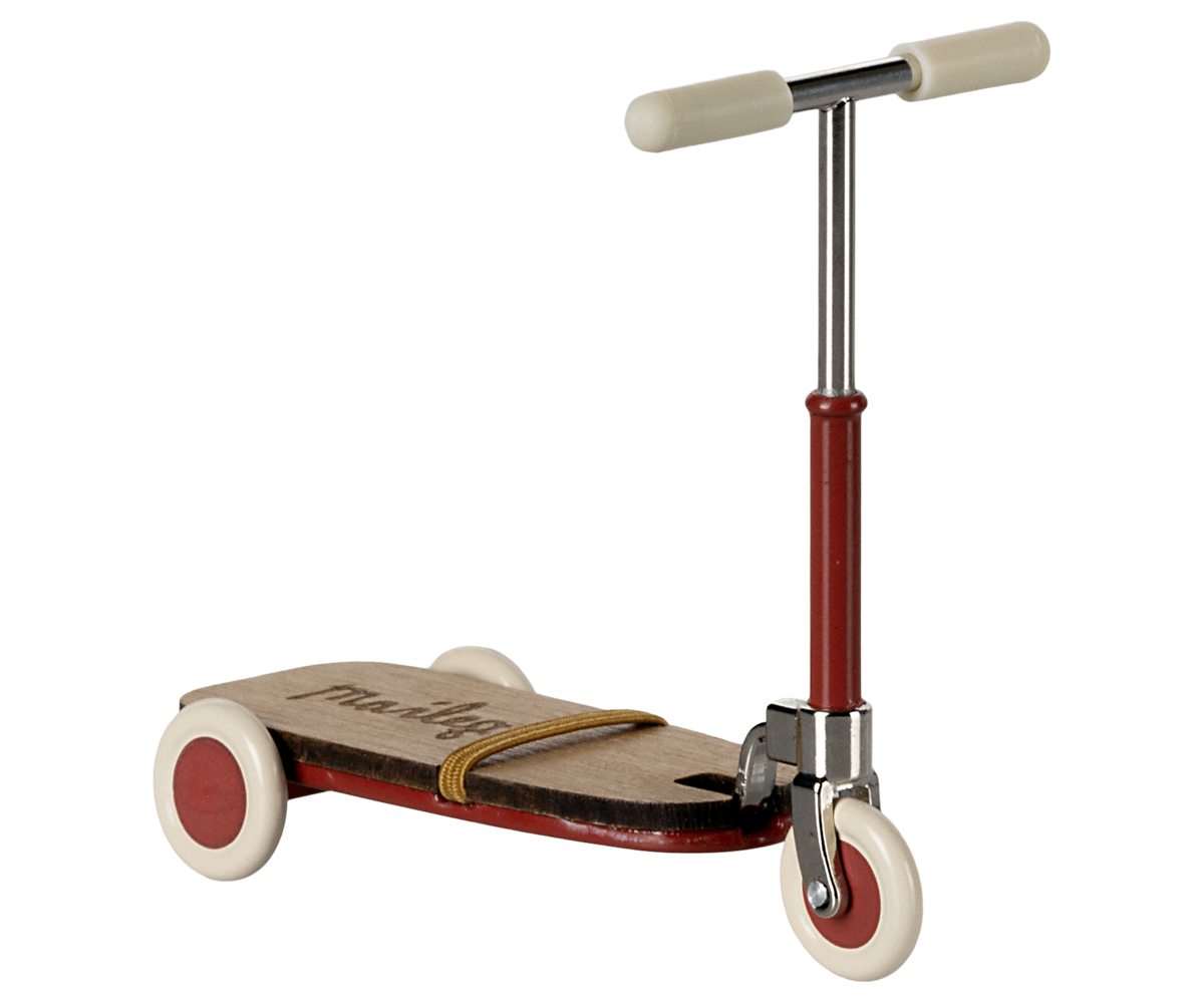 En sparkcykel med fina trädetaljer! Den har en metallpinne i styret så att möss med magneter i tassarna kan hålla sig fast ordentligt. En liten resår på brädan hjälper till att hålla fötterna på plats under färden ? redo för äventyr! Oerhört detaljrik produkt som är helt handgjord av det populära företaget Maileg.