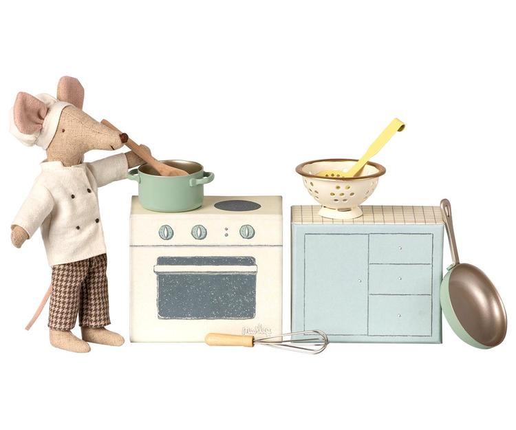 Man måste ju ha lite mat inne i dockhuset, inte sant? Med detta underbara matlagningsset går ingen mätt på morgonen.Oerhört detaljrik produkt som är helt handgjord av det populära företaget MailegSetet innehåller:spis (8 cm x 8 cm x 5 cm )köksbänk (8 cm x 8 cm x 5 cm )kastrull (4 cm)stekpanna, (6 cm)durkslag (6 cm)visp (8 cm)redskap (8 cm)sked ( 8 cm) Ålder: Från 3 år.Material: Hårdpapp,…