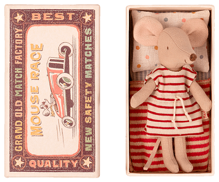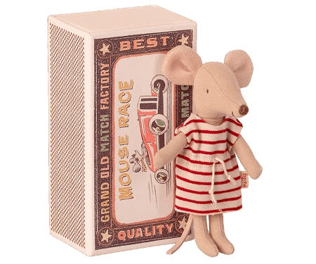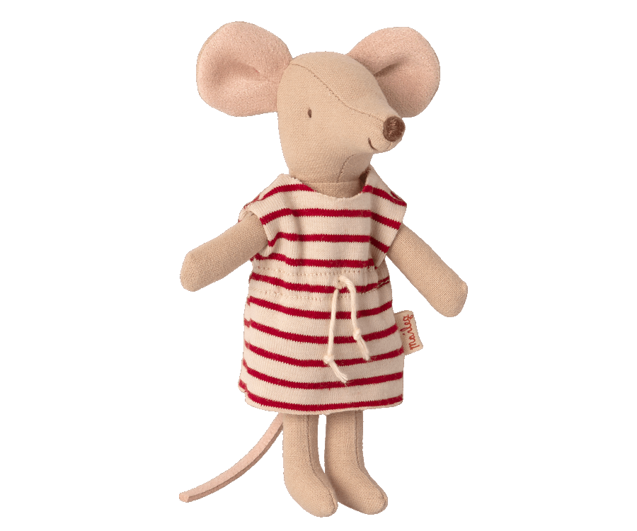 En söt storasyster en liten låda. Storasyster levereras i en fin randig klänning.Mått: 13 cm Ålder: 0-3 år. Material: Bomull/LinneTvättråd: 30 graderDesigner: Maileg